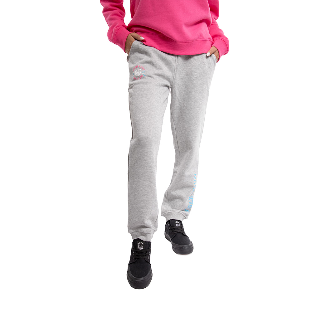 Este jogger mujer Spitfire se presenta en color gris claro melange, y lleva un pequeño estampado en la zona delantera del muslo derecho, con el logo de la marca junto a la frase “Ride The Fire” en colores fucsia, blanco y celeste. Además, lleva estampada la frase “Spitfire Wheels” en color celeste, en la zona de la canilla izquierda. Como sellos de marca este pantalón lleva el nombre de la marca grabado en los topes y ojales metálicos del cordón de ajuste, y la clásica etiqueta Spitfire en la zona interior de la pretina.