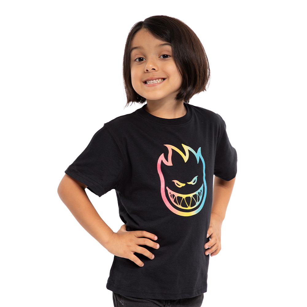 Esta polera manga corta Spitfire se presenta en color negro, y lleva un gran estampado en el pecho con el logo Big Head delineado en gradiente desde fucsia hasta calipso.