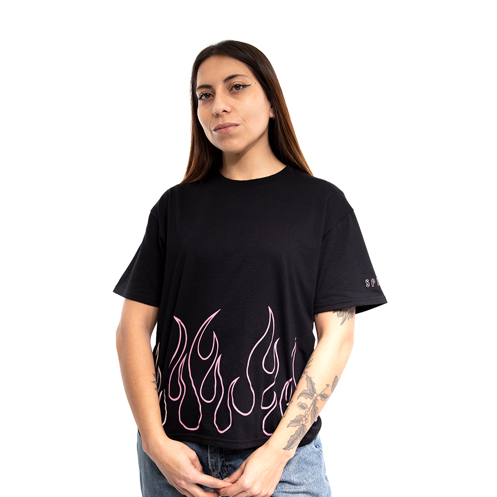 Esta polera manga corta Spitfire se presenta en color negro, y lleva un gran estampado en la zona inferior del torso que simula llamas de fuego, delineadas en color rosado. Además, lleva escrita la palabra “Spitfire” en color rosado en la manga izquierda.