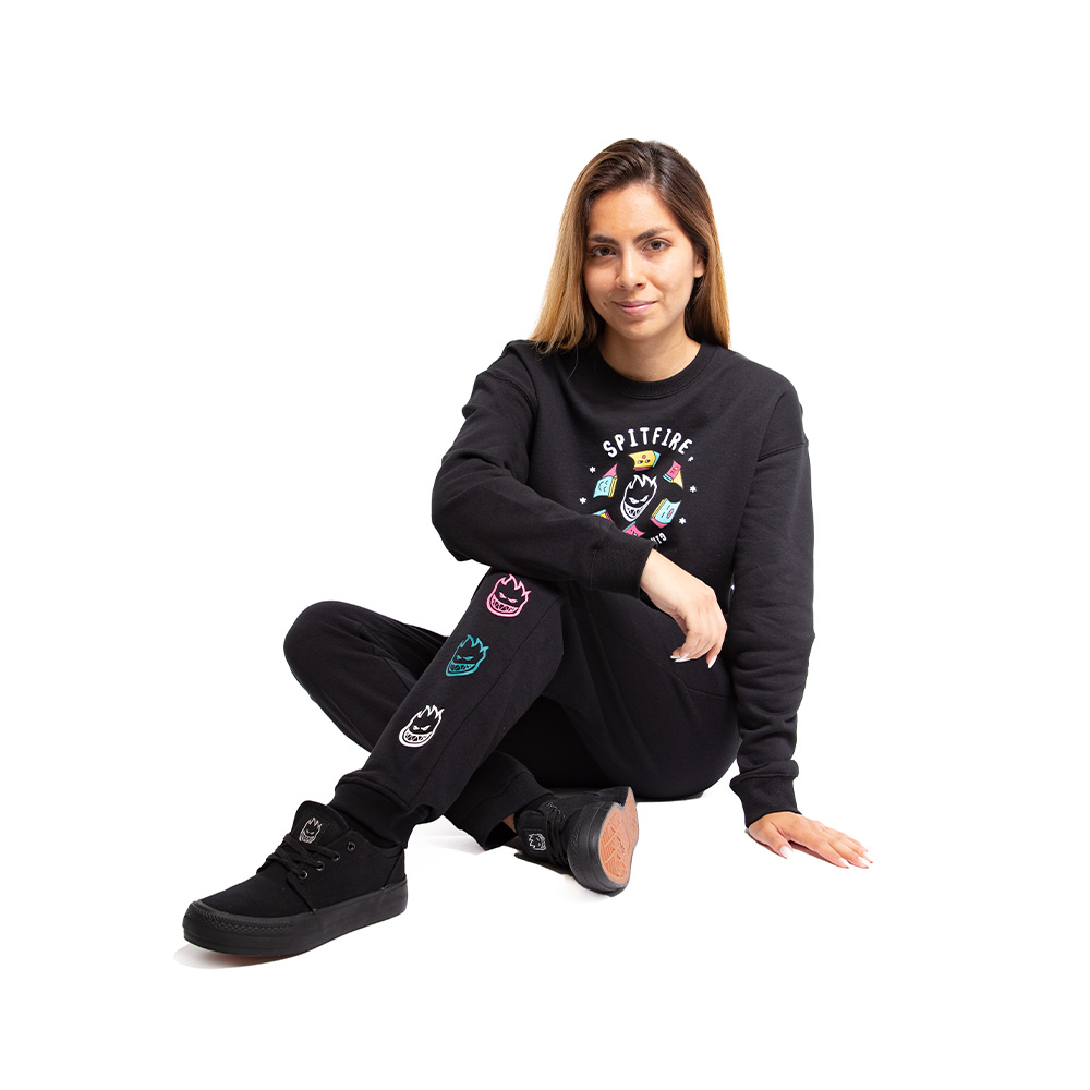 Este jogger mujer Spitfire se presenta en color negro, y lleva estampados tres pequeños logos Big Head en la canilla izquierda, en colores fucsia, celeste y blanco. Como sellos de marca este pantalón lleva el nombre de la marca grabado en los topes y ojales metálicos del cordón de ajuste, y la clásica etiqueta Spitfire en la zona interior de la pretina.