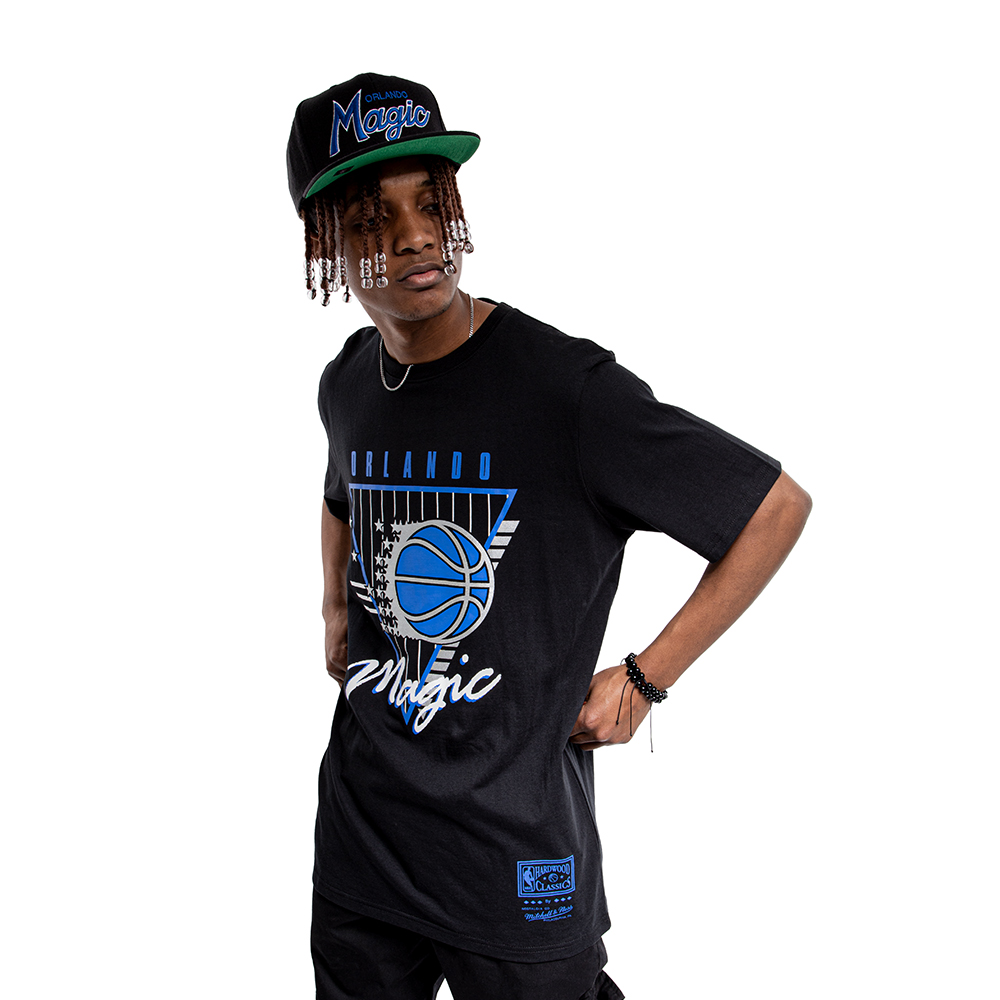 ¿Buscas una manera de mostrar tu apoyo a los Magic de Orlando? No busques más que esta camiseta premium de manga corta de Mitchell and Ness. Esta camiseta viene en negro con una serigrafía del logo de los Orlando Magic en los colores clásicos del equipo, azul y blanco.